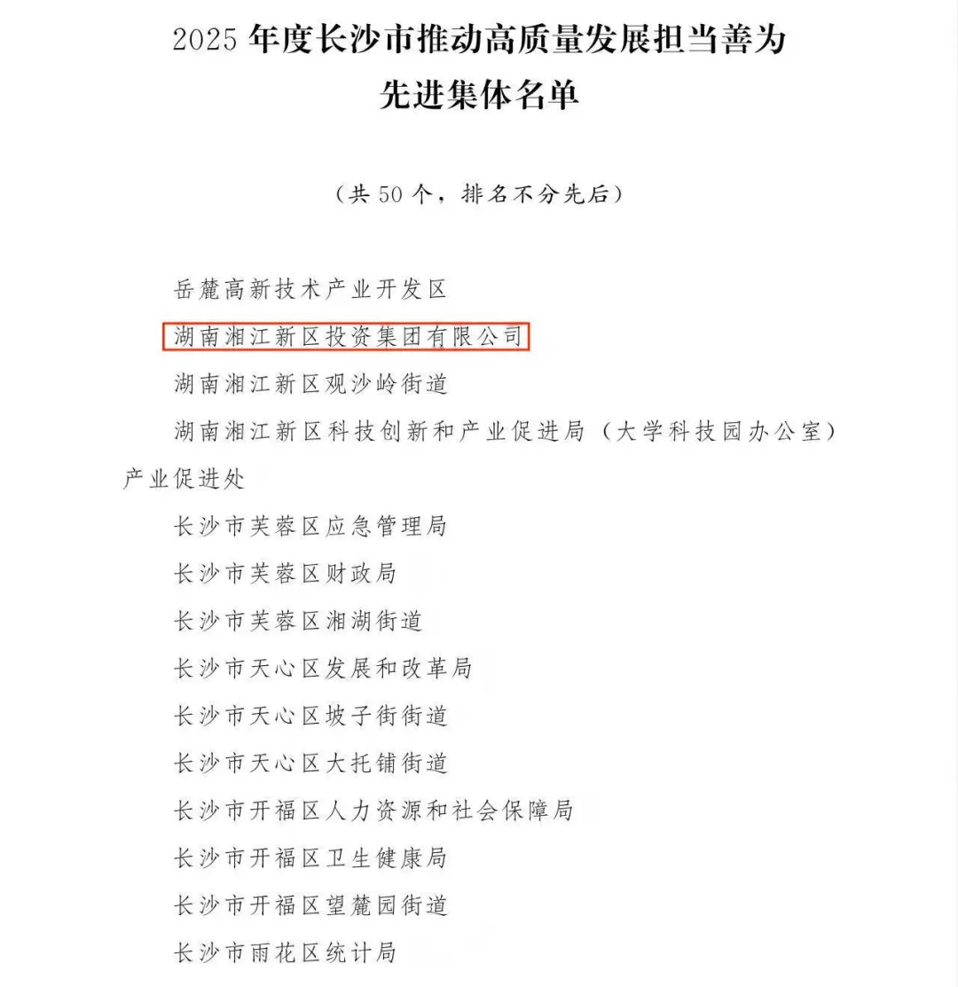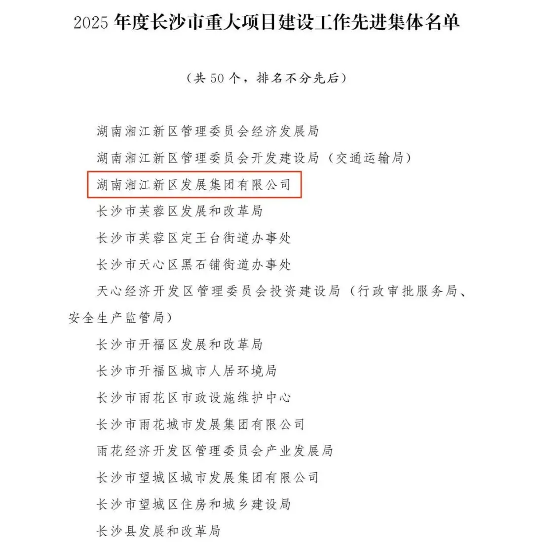 为表彰先进、树立标杆,进一步激发全市上下抓项目、促发展的责任感和使命感,营造全市“大抓项目、抓大项目”的鲜明导向和浓厚氛围,经市委、市人民政府同意,决定对2025年度长沙市重大项目建设工作50个先进集体和100名先进个人予以通报表彰。其中,湘江集团获评2025年度长沙市重大项目建设工作先进集体,湘江集团湘新投公司获评2025年度长沙市推动高质量发展担当善为先进集体。
